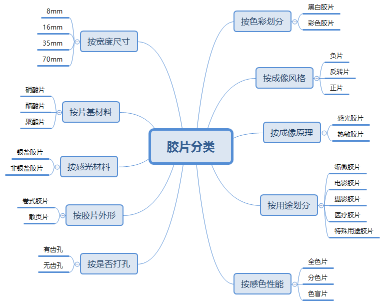 可分為銀鹽膠片和非銀鹽膠片。銀鹽膠片實(shí)際上是指涂覆在片基上的感光涂層采用明膠型銀鹽乳劑,由懸浮在明膠中對光敏感的鹵化銀顆粒組成,較為常見。非銀鹽膠片包括微泡膠片、重氮膠片、干銀膠片等,感光速度和長期保存性不如銀鹽膠片,主要用于拷貝和利用。